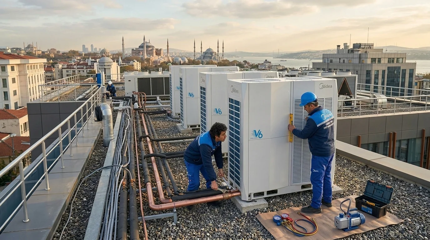 Midea dış ünitelerinde bulunan dijital ekranlar, sistemdeki 100'den fazla veriyi anlık olarak raporlar. Uzman teknisyenlerimiz, bu verileri kullanarak "şansa bırakılmayan" bir montaj ve devreye alma süreci yürütür. Onarım süreçlerinde ise orijinal Midea VRF klima yedek parçalarını stoklarımızdan anında tedarik ederek, işletmenizin iklimlendirme konforunu kesintiye uğratmıyoruz.